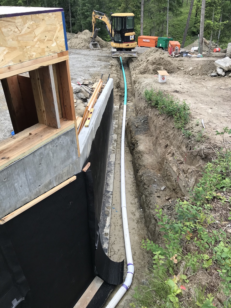 In the below two photos you can see two sides of the foundation with french drain pipes running out the hillside to daylight. A french drain is a perforated 4" PVC pipe placed at the level of the foundation footer and covered with drain rock and a filter fabris and fill. This drain allows water that gets to the foundation to escape to daylight rather than put hydrostatic pressure on the basement walls.